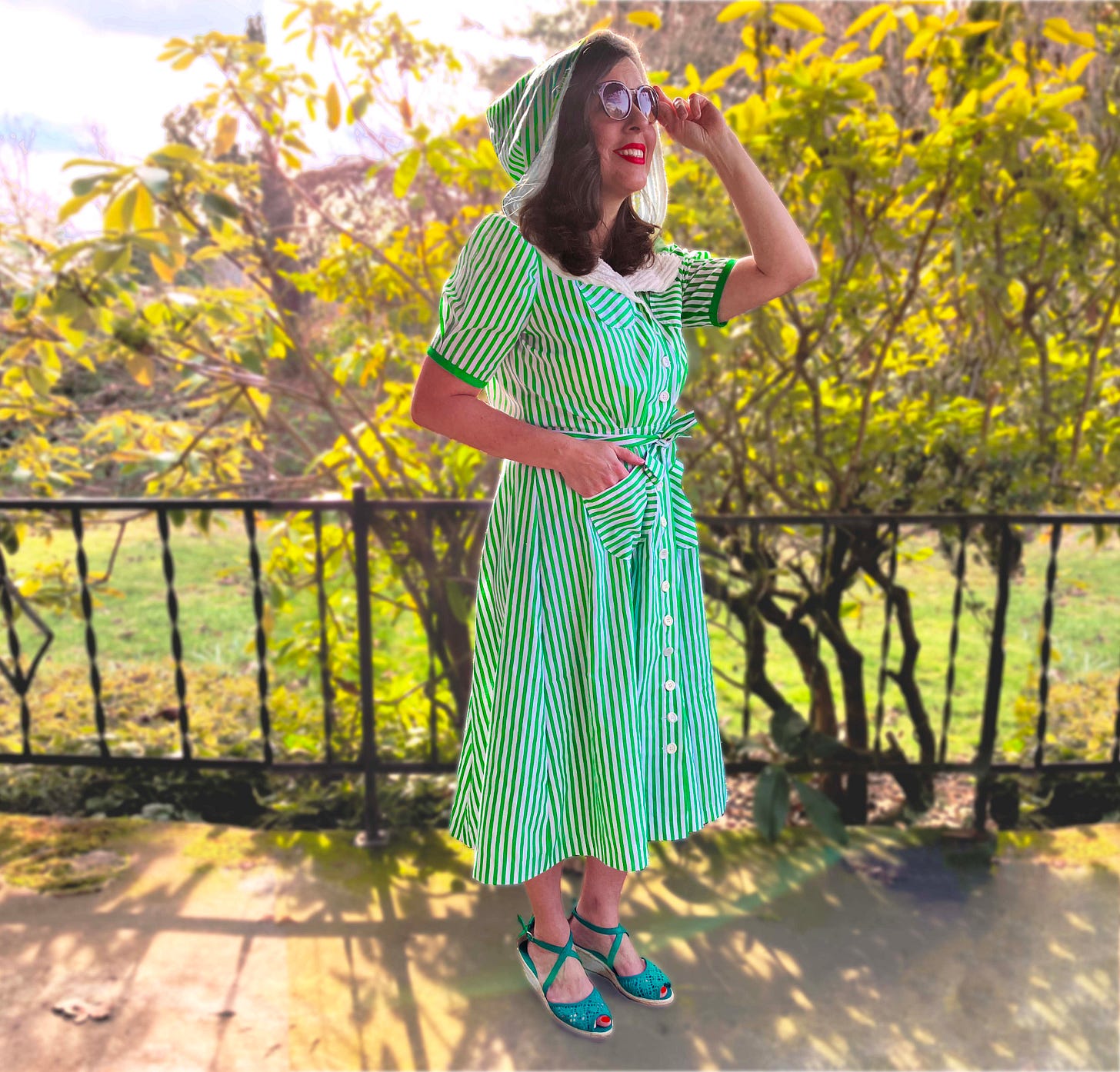 Additionally, I can’t actually walk in shoes with any kind of a heel on them anymore—not even these little wedges—ever since I busted my foot in a car accident a few years ago. I like having a reason to put on cute vintage shoes every once in a while, even if it’s just to hobble out on the porch and snap a few photos. (And yes, these photos are pretty ‘shopped, if just to photoshop out the creepy foot/ankle scars from two surgeries! Oh yeah and I also photoshopped on my toenail polish in both pictures, since I realized after-the-fact that my toes looked pretty drab and needed some livening up!)