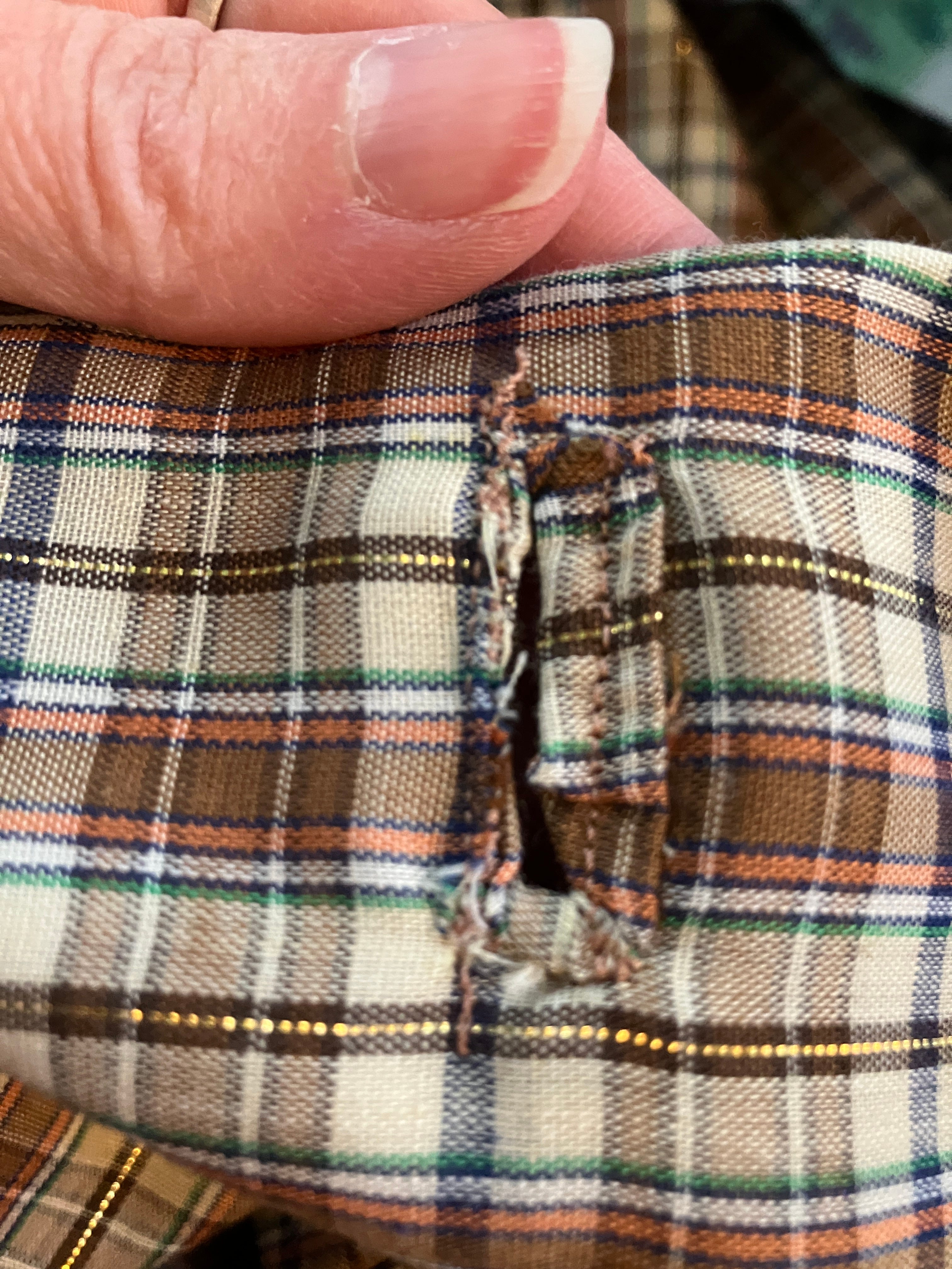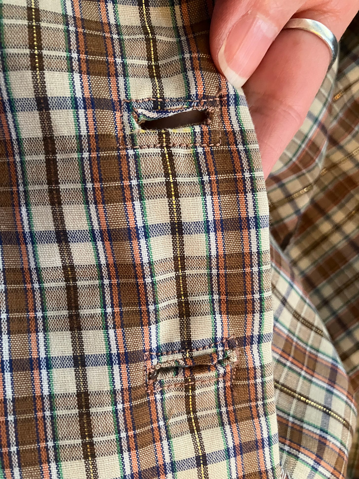 One of the reasons I fussed around with the buttonholes so much is because this was my very first attempt at making bound buttonholes. This was sort of a half-success. That is to say, I did about half of the buttonholes as bound buttonholes, then I gave up and did the rest of them with my machine buttonhole setting.